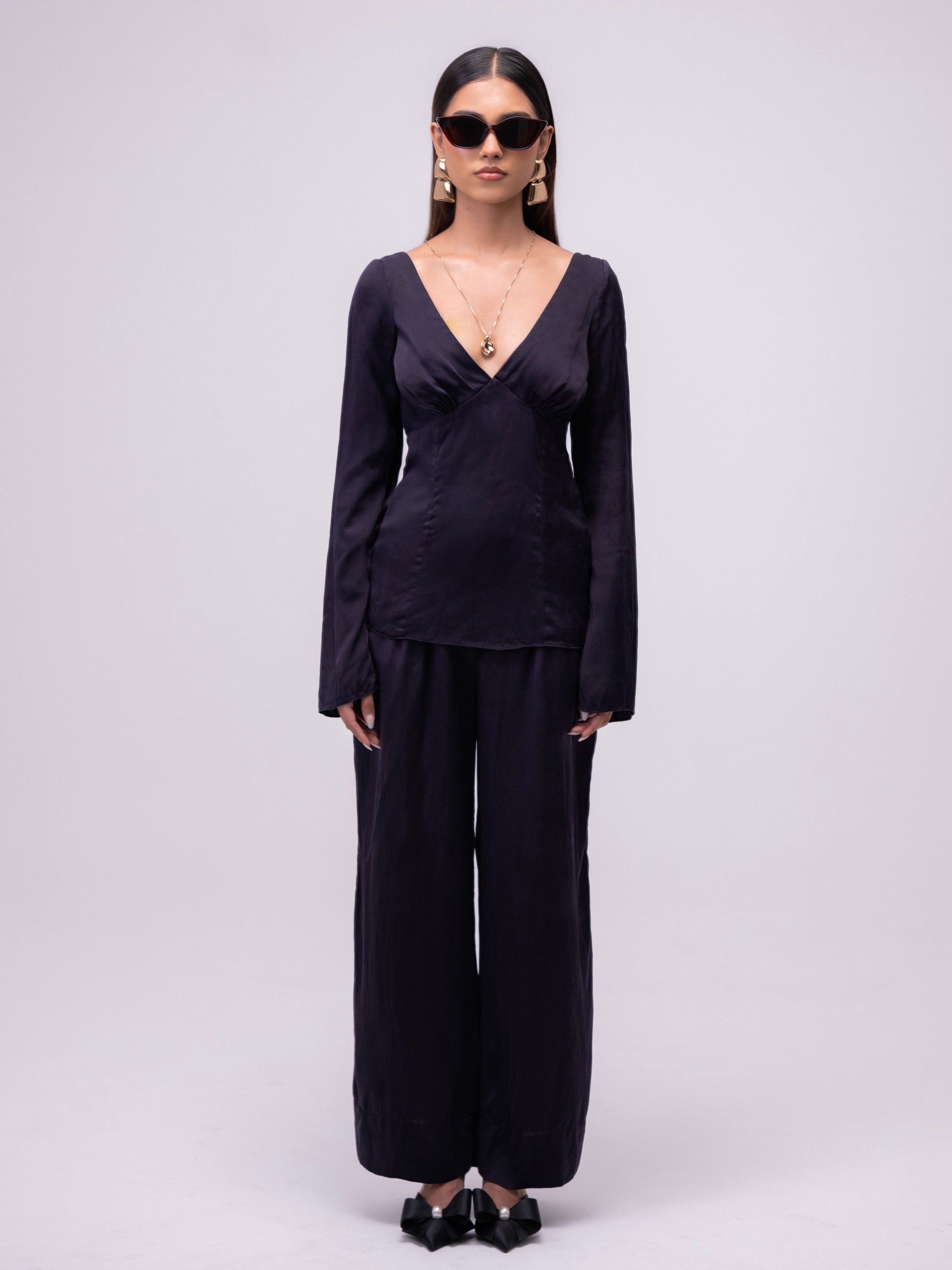 Tailored fit blouse with a deep V neckline and flared sleeves. Features an invisible side zip for ease of wear.